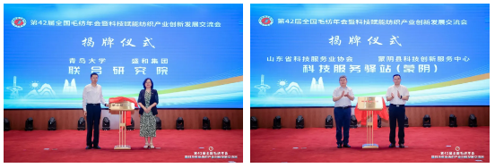 ![]() 青岛大学教授曲丽君、蒙阴县县长苗运全共同为“青岛大学与山东盛和纺织集团联合研究院”揭牌。山东省科技服务业协会会长党安涛、临沂市科技局局长张成共同为山东省科技服务业协会“科技服务驿站(蒙阴)”揭牌。