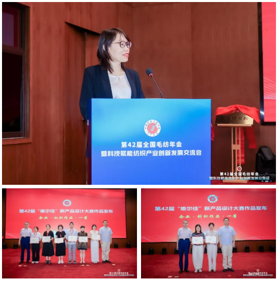 ![]() 随后,中国纺织工程学会毛纺织专业委员会秘书长、《毛纺科技》主编文美莲,发布新一届“唯尔佳”新产品设计大赛的入选结果。包括企业产品和高校作品2类。