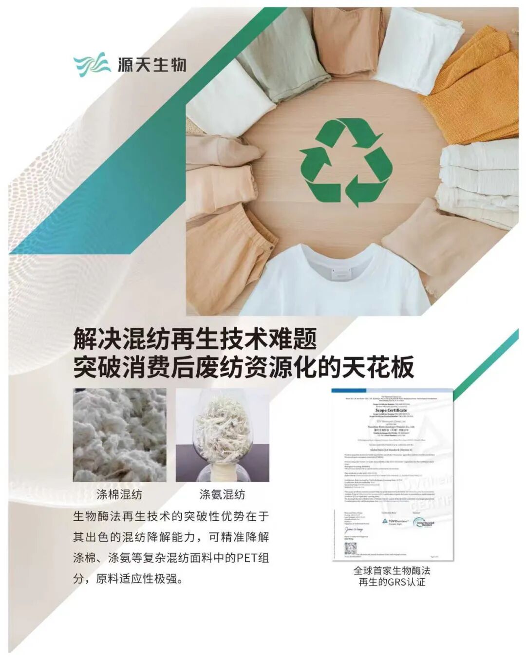 ![]() 然而,纵观纺织循环再生领域发展现状,物理回收技术虽成熟,但原料受限且回收后性能下降;化学回收则能耗高、流程复杂,尤其是对于混纺类产品的处理相对困难。而源天生物的生物酶技术,为纺织循环再生产业开辟出一条兼顾环保与效益的新路径。