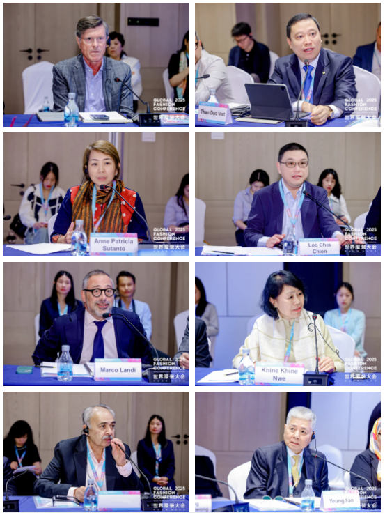 ![]() 图:以上依次为国际纺织制造商联合会主席、西班牙纺织与时尚产业观察委员会主席Juan Pares,越南纺织服装协会副会长Than Duc Viet,印尼纺织服装协会会长Anne Patricia Sutanto,柬埔寨纺织、服装、制鞋和箱包协会秘书长Loo Chee Chien,意大利手工艺部门和中小企业国家联盟主席Marco Landi,缅甸服装制造商协会秘书长Khine Khine Nwe,印度服装制造商协会代表,香港纺织商会会长杨勋