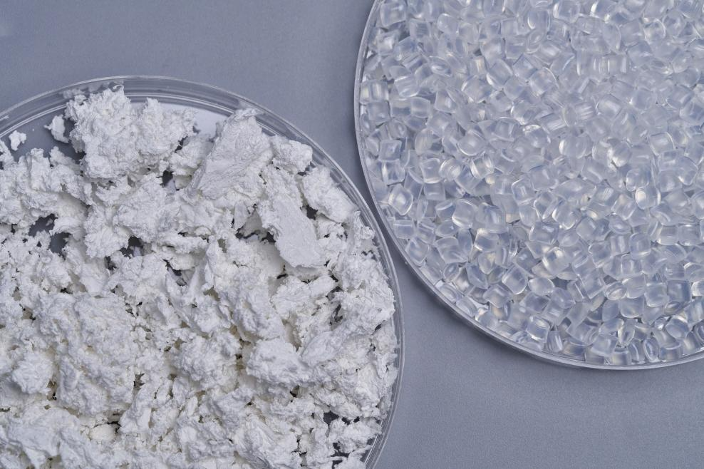 ![]() 再生尼龙絮片(左)及再生尼龙颗粒(右)
