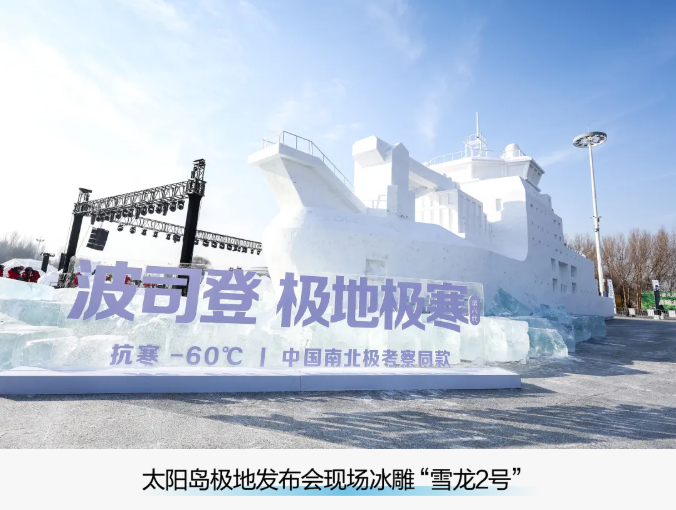 发布会现场,一座以中国首艘自主建造的极地考察破冰船“雪龙2号”为原型的冰雪地标亮相,由哈尔滨本土雪雕师联手千万级粉丝非遗文化博主江寻千打造。走近这个作品,人们仿佛亲临极地冰川,见证一个又一个关于波司登挑战寒冷的故事。