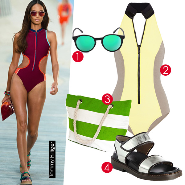 马尔代夫,海边躺椅造型:在热带海岛度假就理所当然地穿上热带植物印花比基尼?关注潮流的你不难发现如今的海滩装扮,运动风正当道。何不用潜水员风格的舒适连体泳衣与未来感十足的休闲凉鞋展现你的活力呢? 1.Illesteva太阳镜. 2.Lisa Marie泳衣. 3.Bright by Black沙滩包. 4.Marni凉鞋.