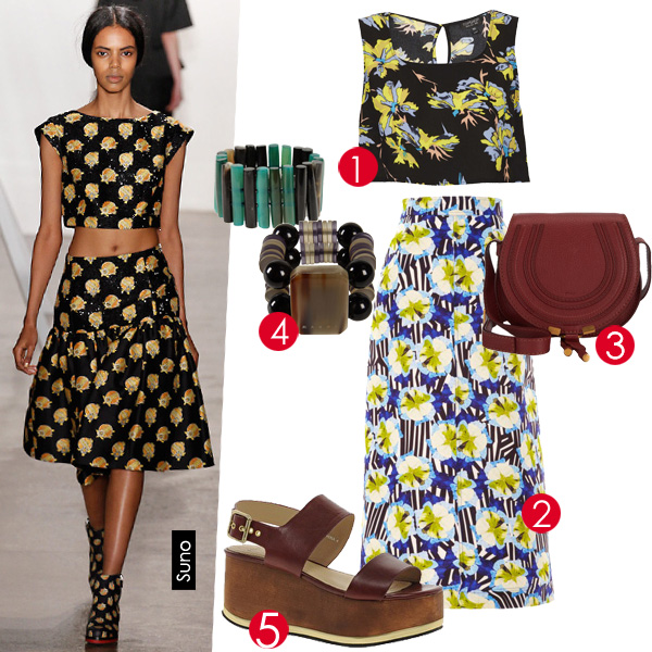 马尔代夫,看日落造型:短上衣与高腰长裙的搭配露出一缕含蓄的性感,大胆花卉印花碰撞出的火花搭配漫天的红霞此时再应景不过。 1.Topshop上衣. 2.Mother of Pearl长裙. 3.Chloé包. 4.Marni手链. 5.Asos鞋.