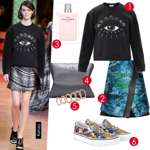 纽约,逛街SOHO造型:古灵精怪的眼睛图案套头衫彰显怪诞潮流感,湖蓝色的缎面短裙让你不失女人味,限量版的Kenzo for Vans板鞋使造型“酷”与舒适兼具。 1.Kenzo上衣. 2.Proenza Schouler短裙. 3.Narciso Rodriguez香水. 4. 3.1 Phillip Lim手拿包. 5.Lomo连体戒指. 6.Kenzo for Vans板鞋.