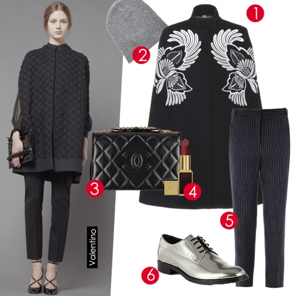 纽约,漫步中央公园造型:斗篷散发浪漫气息,小便帽搭配利落的七分裤和牛津鞋呼应这座城市的标志性酷感,点睛的银色令你不失都市气息。 1.Stella McCartney斗篷. 2.Alexander Wang帽子. 3.Chanel包. 4.Tom Ford口红. 5.Stella McCartney长裤. 6.Tod's鞋.