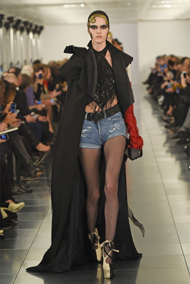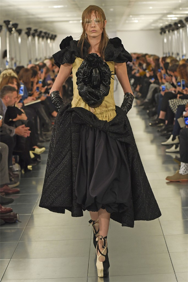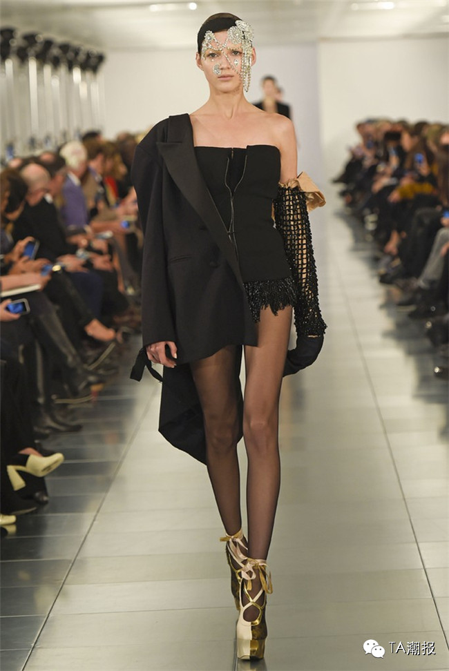 加里亚诺式的Maison Margiela,没有了原来MMM白胚布风格那种高冷的傲气,倒是加入了“鬼才”风格的性感与造型感。特别是那一组红装,显然偏离了MMM的中性风格,倒是后面的几套中性黑西服,隐约还魂了MMM的影子。