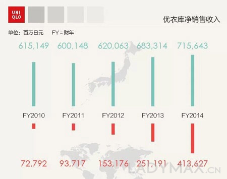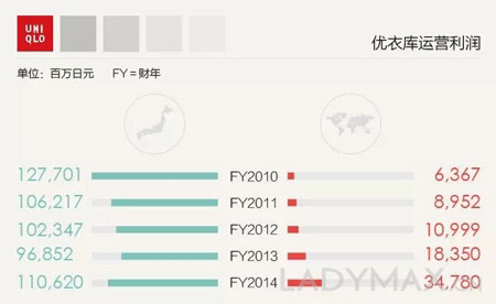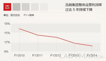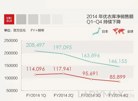 但亮丽的数字背后,隐忧已经出现。事实上如果分别看2014年优衣库所属母公司——日本迅销集团每个季度的财报,营收下降的趋势就赫然浮现了。2014年,迅销一共两次调低过营收预期。