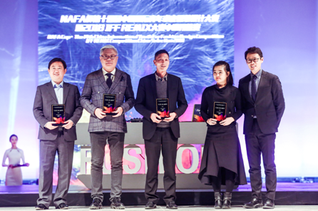 (从左至右)华斯控股股份有限公司贺素成、北京元隆皮草皮革有限公司李庆元、银杉皮草有限公司陆荣坤、天津芭而蒂服饰有限公司黄丽丽、北京国际裘皮革皮制品交易会秘书长徐洪强 伯乐奖 NAFA北美裘皮拍卖行